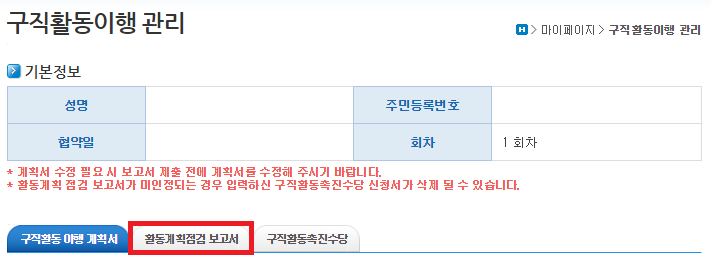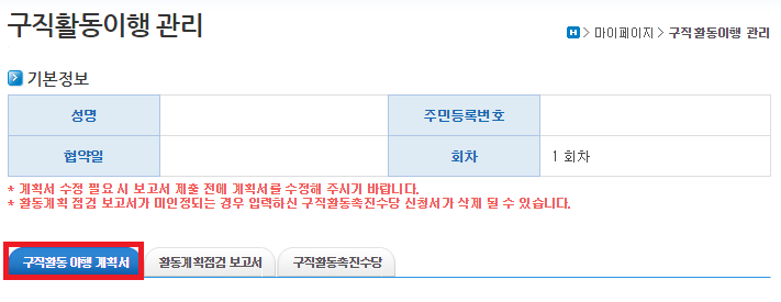 구직활동 이행 계획서 탭이 뜨고 자신의 구직 계획을 적는 칸이 나온다.